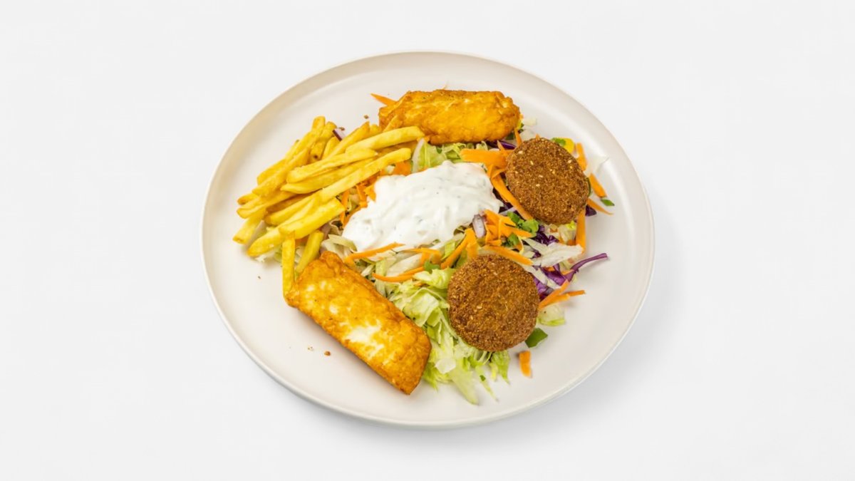 Halloumi, falafel, hranolky, salát, omáčka