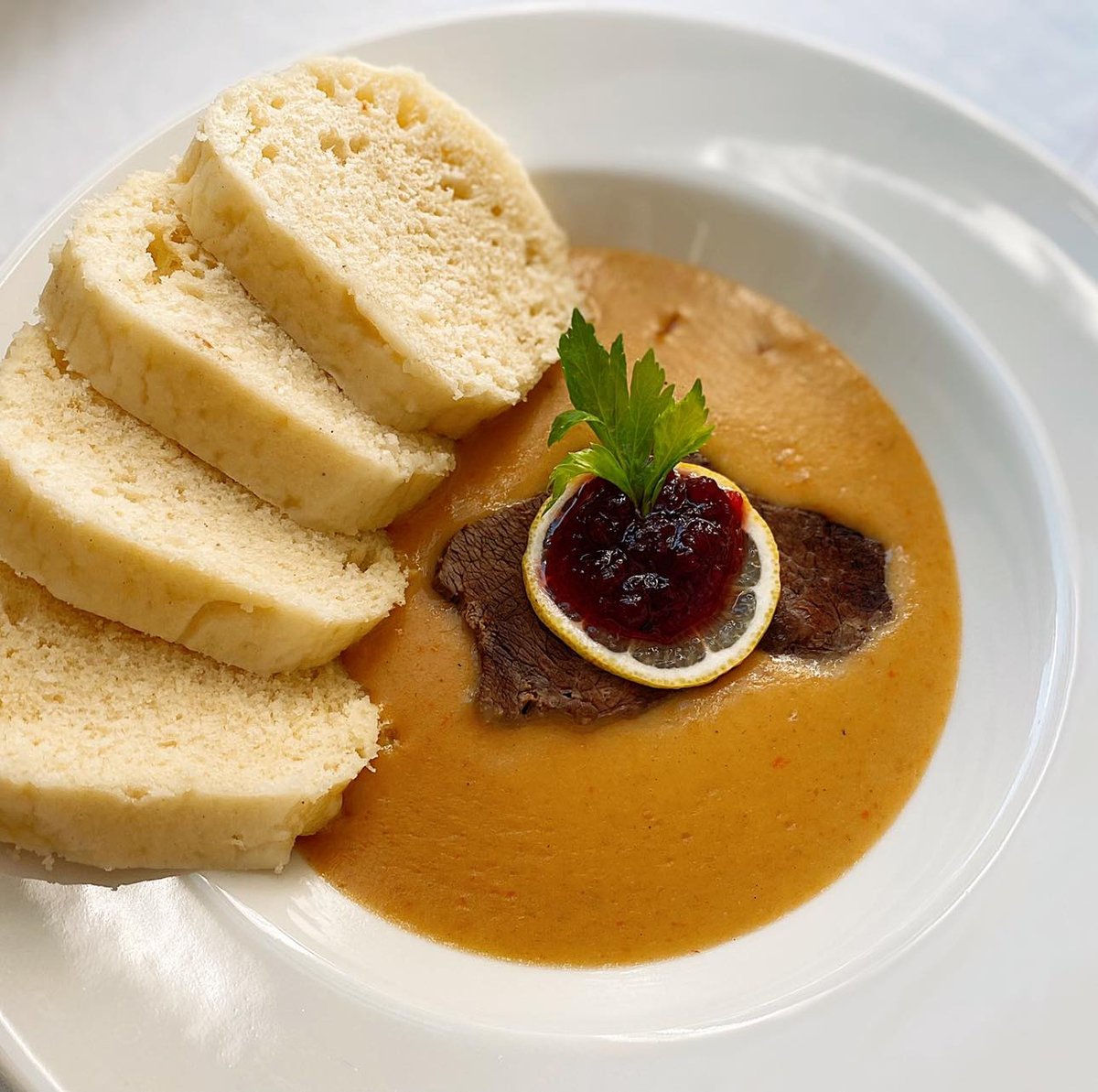 1. Svíčková (hovězí zadní) na smetaně s brusinkami a šlehačkou, houskové knedlíky