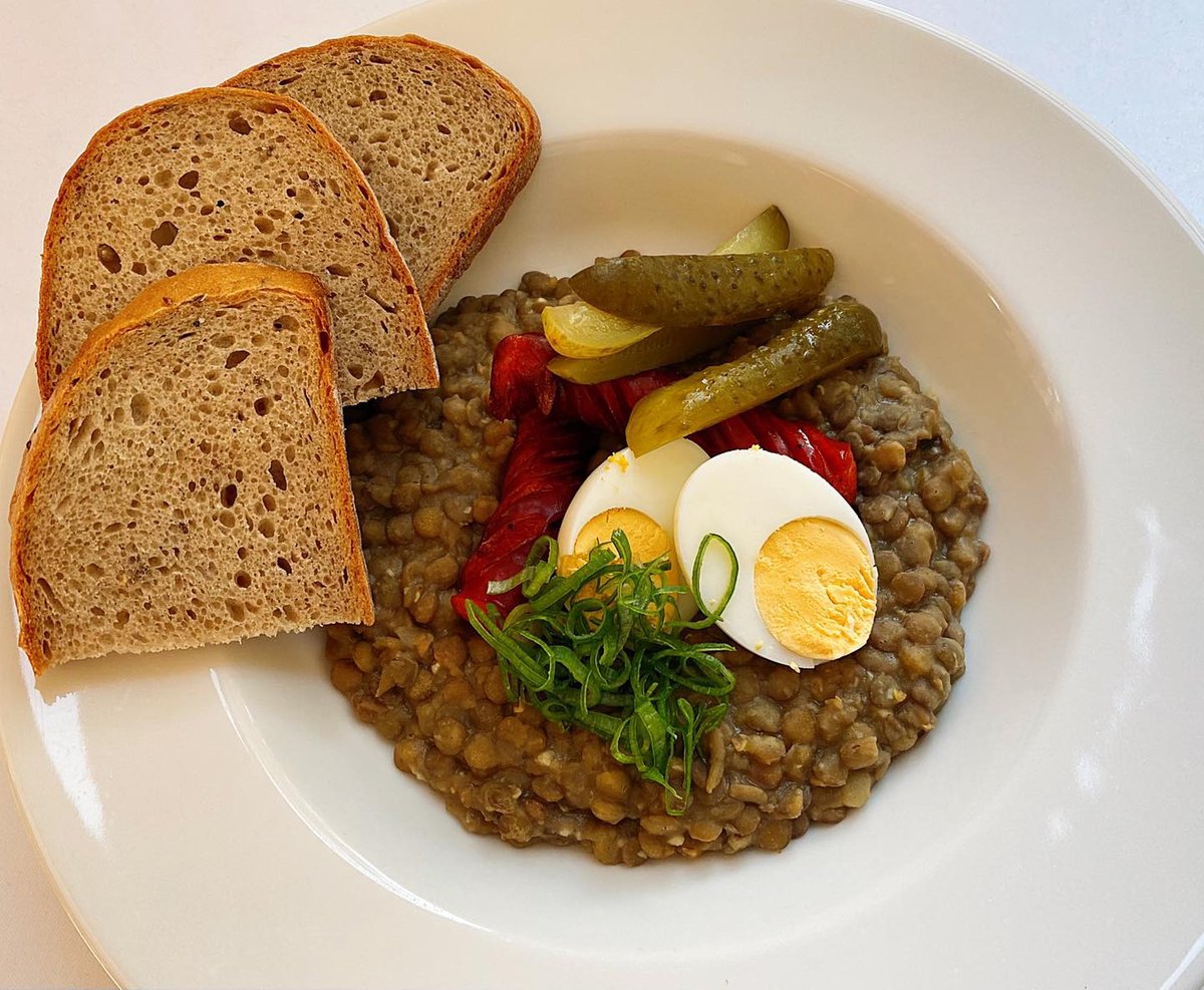 3. Čočka na kyselo, vejce, opečené cigáro, nakládaný okurek, chléb