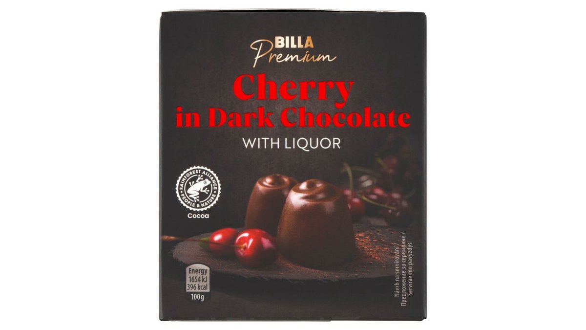 BILLA Premium Formované bonbony z hořké čokolády s náplní s višní v alkoholu 168g