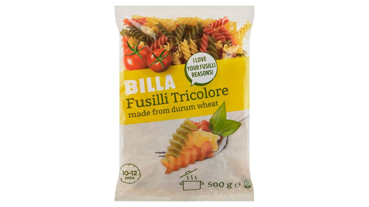 BILLA Fusilli Tricolore těstoviny semolinové sušené se špenátovým a rajčatovým práškem 500g
