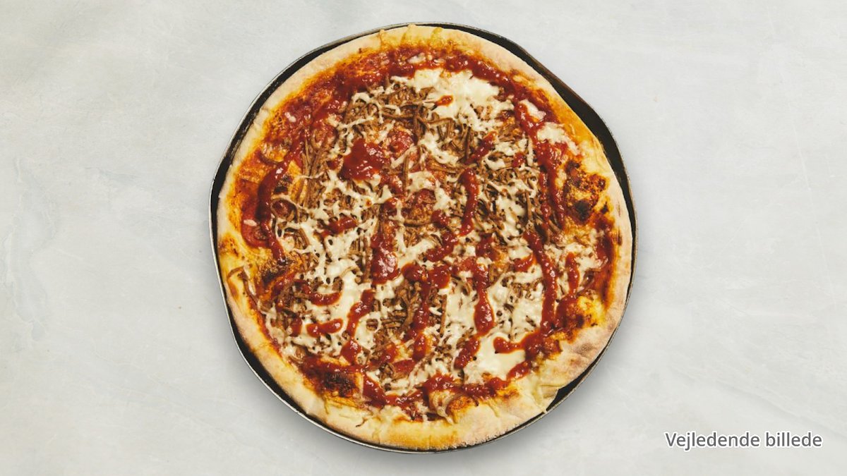 Tomatsauce, ost, kødsauce, majs, løg, hvidløg og chili.