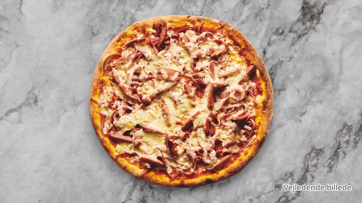 Tomatsauce, ost, skinke, kødboller og cocktailpølser.
