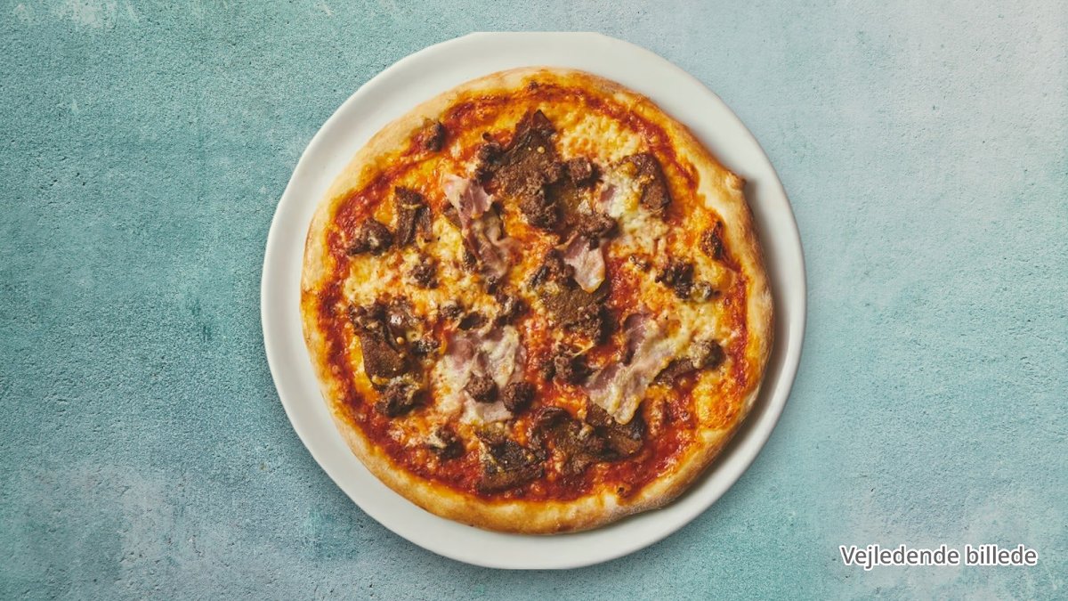 Tomatsauce, ost, skinke, kødsauce og bacon.