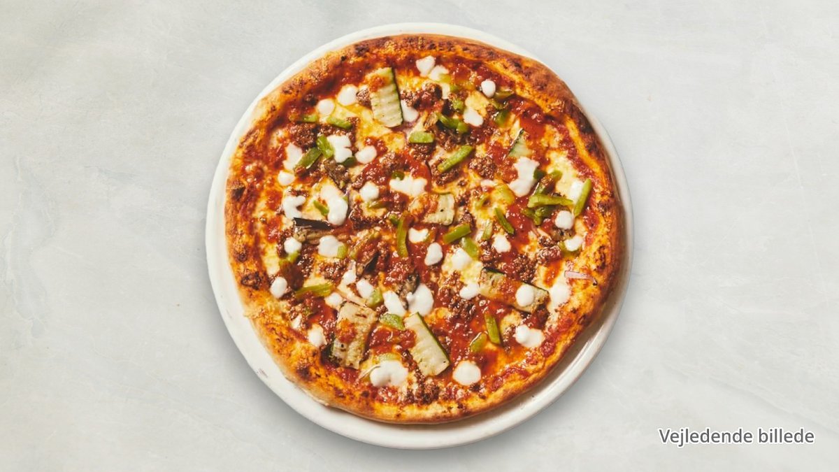 Tomatsauce, ost, kebab, skinke, majs, jalapeños, creme fraiche og hvidløg.