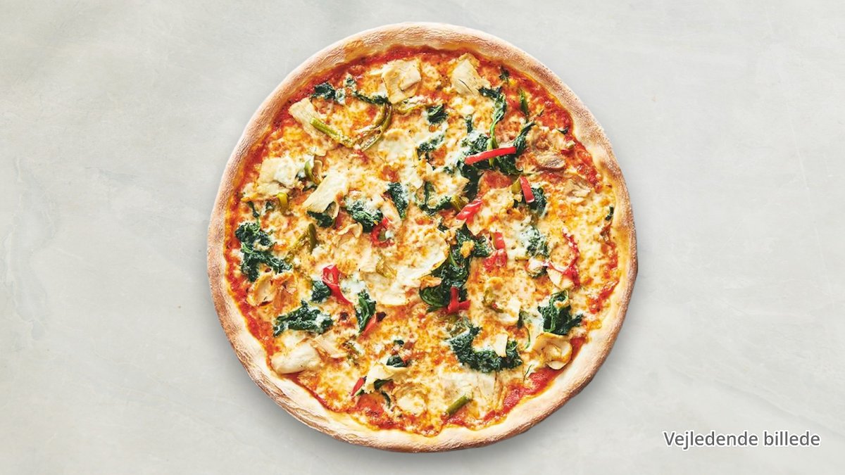 Tomatsauce, ost, spinat, gorgonzola, kylling og løg.