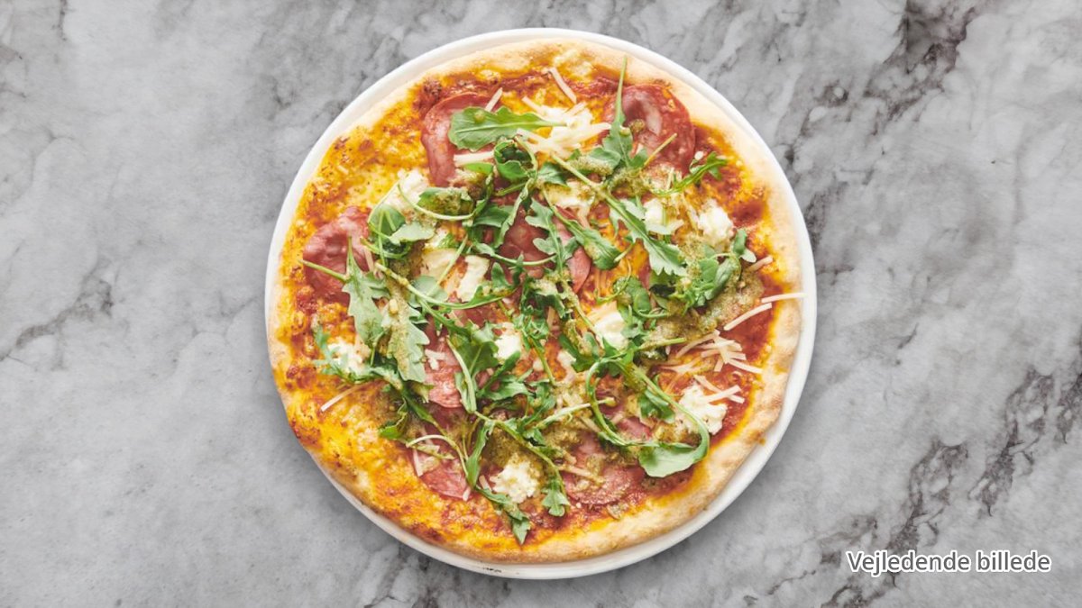 Tomatsauce, ost, mozzarella, tomat, basilikum, hvidløg, bacon og rucolasalat.