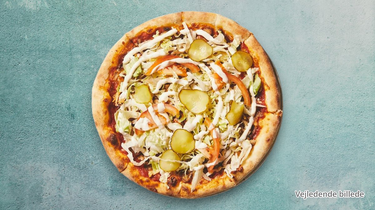 Tomatsauce, ost, pepperoni, kebab og salatost.