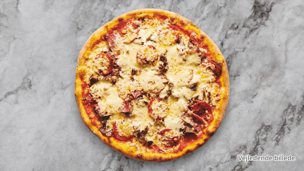 Tomatsauce, ost, skinke, pepperoni og bacon.