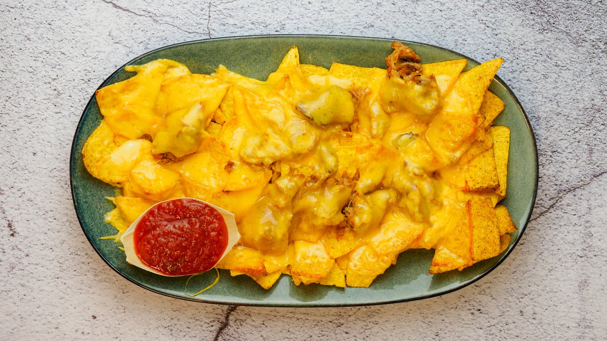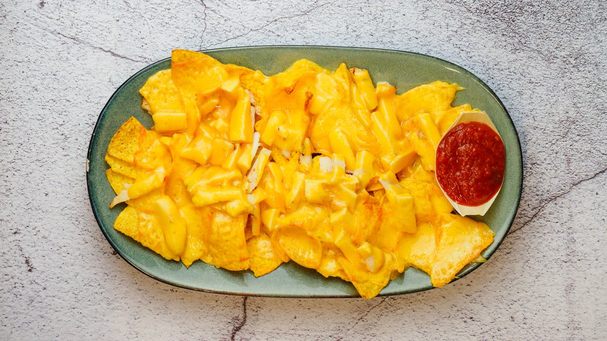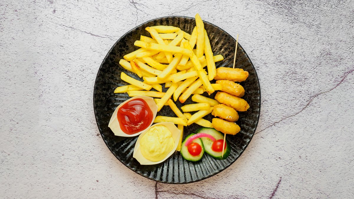 Nuggets, chili cheese nuggets, mozzarella sticks og andre snacks efter kokkens valg serveret med chilimayo og krydderdressing