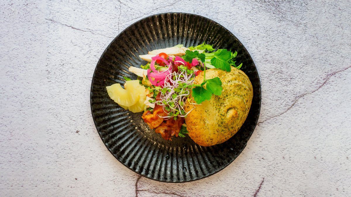 Munkebolle med fyld af kyllingebryst i skiver, bacon, ananas, frisk salat, syltede rødløg, pesto og karrydressing