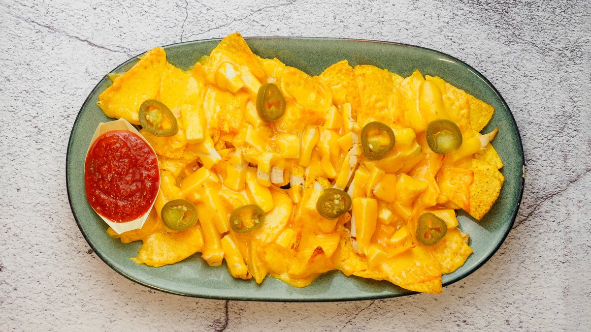 Kyllingebryst i stykker, jalapeños, chili og cheddar serveret med valgfri dressing