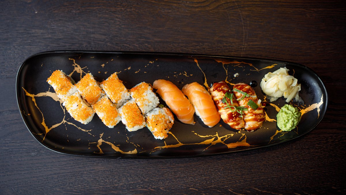 Nigiri: 2 x Laks 1 x Tun 1 x Reje Nigiri Uramaki: 4 x Spicy Laks 4 x California