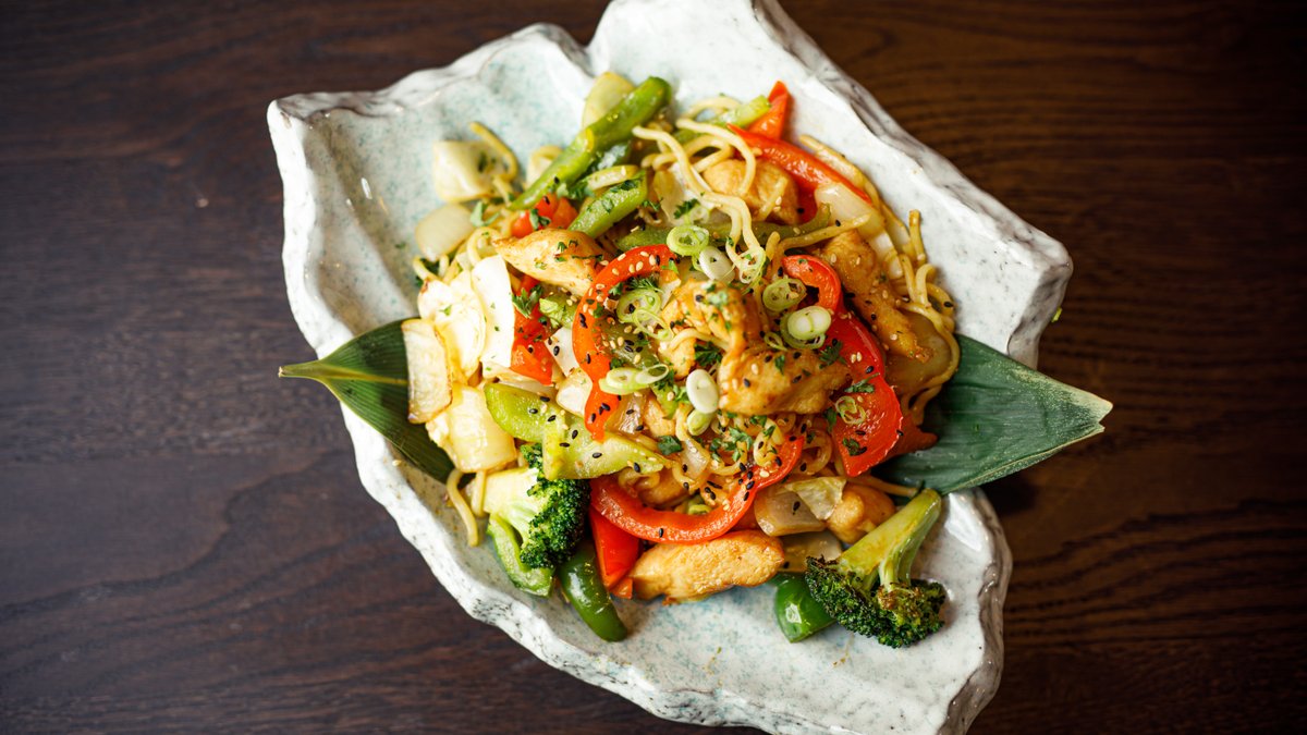 Stegte nudler med kylling og grøntsager.