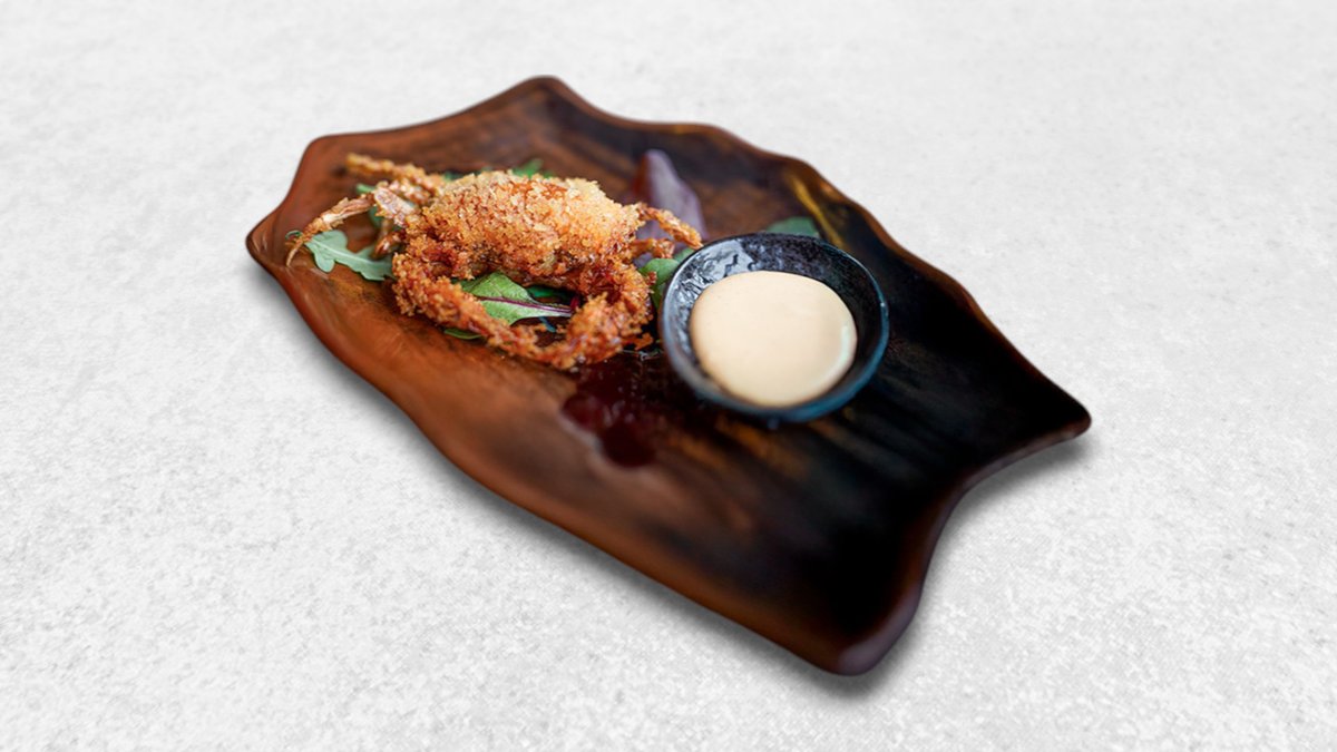 Friturestegt krabbe. Serveres med salat og grøntsager.
