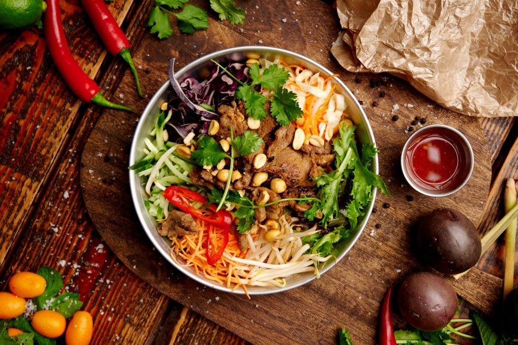 Grillet oksekød, marineret i eksotiske krydderier, syltede og revede gulerødder, kål, bønnespirer, agurk, rødkål og forårsløg på en valgfri bund. Toppes med peanuts, koriander og soya vinaigrette. Serveres med valgfri drikkevarer.