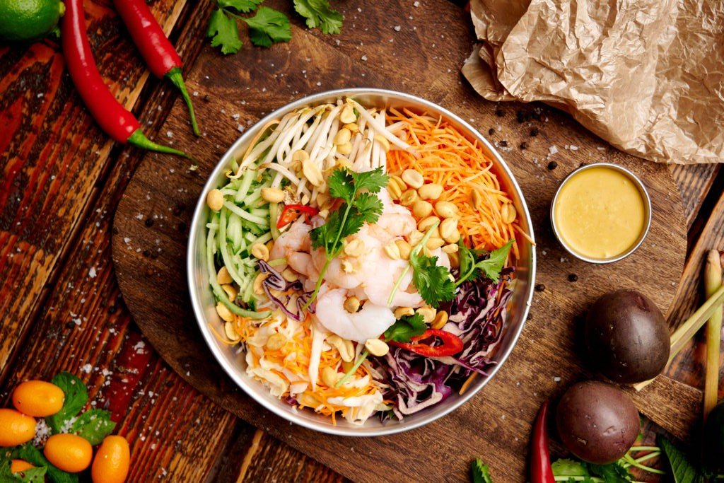 Tigerrejer, syltede og revede gulerødder, kål, bønnespirer, agurk, rødkål og forårsløg på en valgfri bund. Toppes med peanuts, koriander og tom yum creme. Serveres med valgfri drikkevarer.