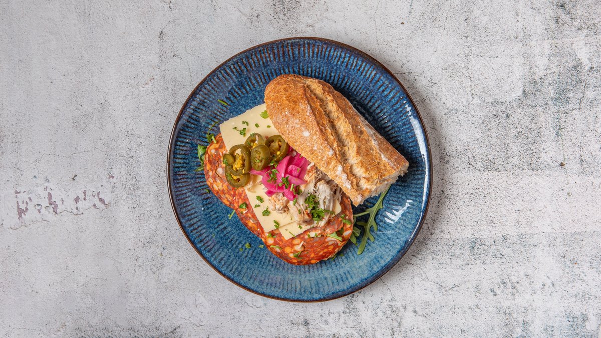Grillet surdejsbrød smurt med pisket smør og fyldt med kylling, ventricina, modnet havarti, salat, syltede rødløg og jalapeños.