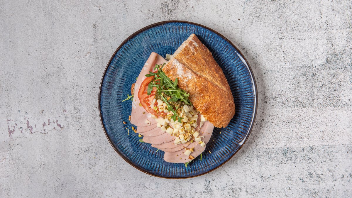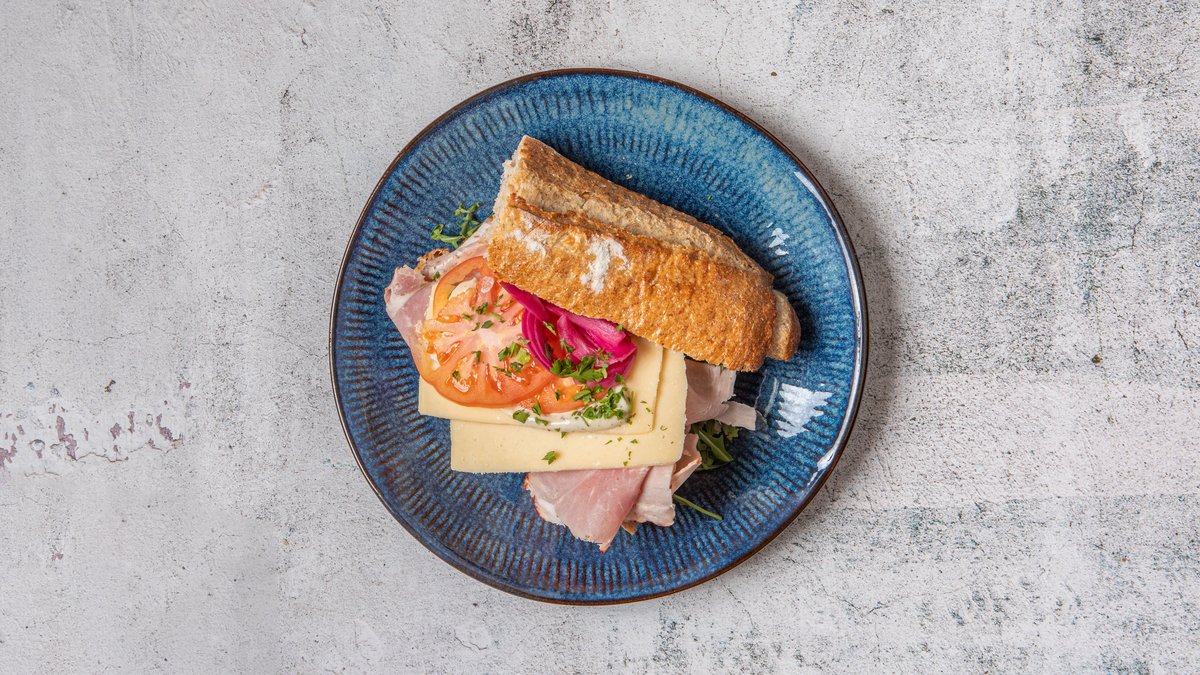 Grillet surdejsbrød smurt med pisket smør og fyldt med prosciutto cotto, modnet havarti, syltede rødløg, tomat og dijonmayo.
