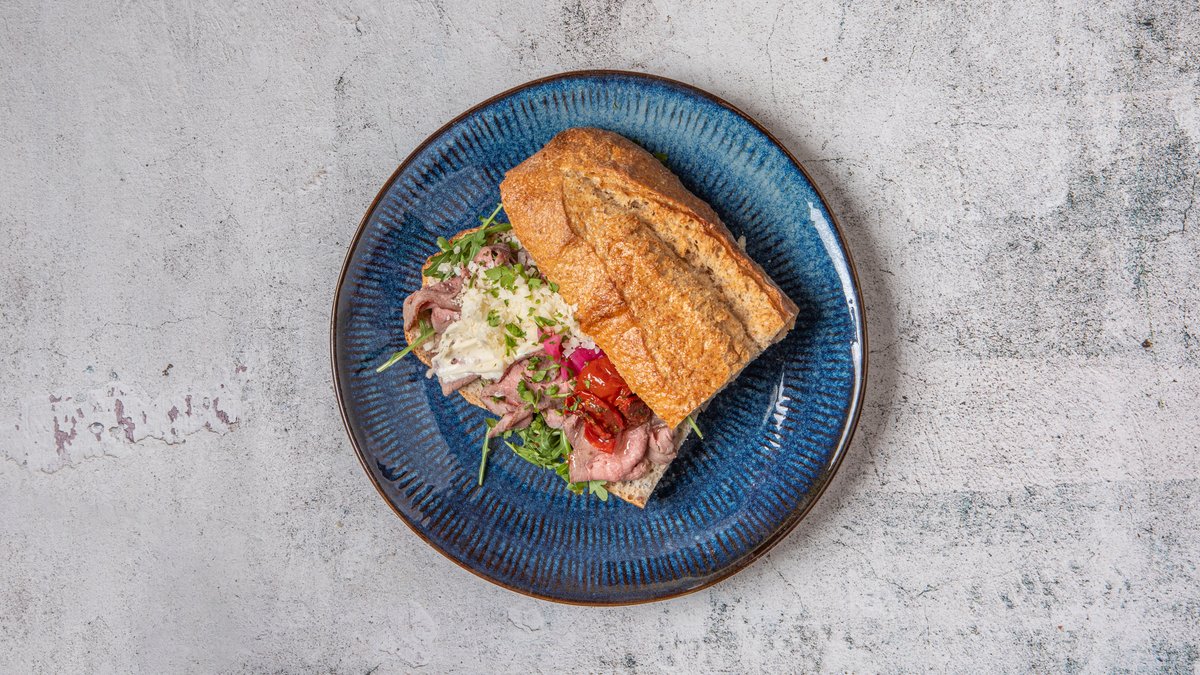 Grillet surdejsbrød smurt med pisket smør og fyldt med rosastegt okse, syltede rødløg, bearnaisecreme, salat og parmesan.