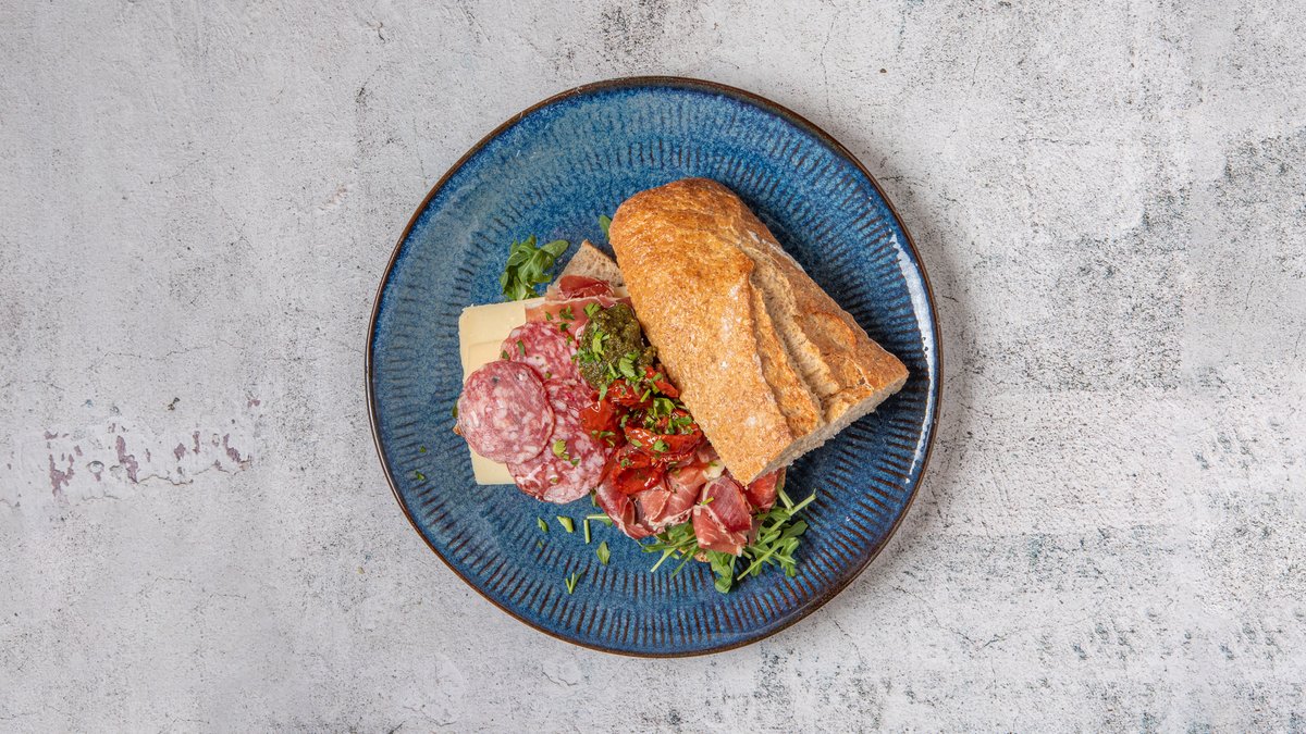 Grillet surdejsbrød smurt med pisket smør og fyldt med lufttørret skinke, trøffelsalami, mozzarella, pesto, semidried cherrytomater og salat.