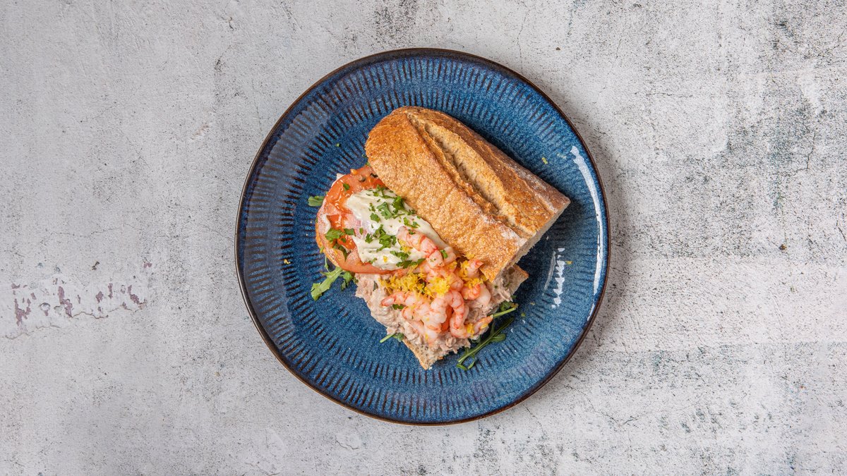 Grillet surdejsbrød smurt med pisket smør og fyldt med rørt tun, håndpillede rejer, tomat, salat og urtecreme.