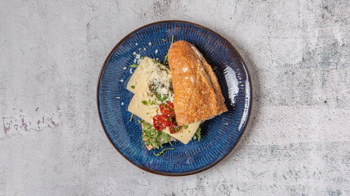 Grillet surdejsbrød smurt med pisket smør og fyldt med mozzarella, modnet ost, parmesan, salat, semidried cherrytomater og pesto.