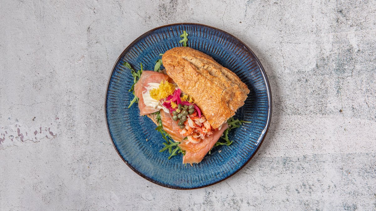 Grillet surdejsbrød smurt med pisket smør og fyldt med røget laks, krebsehaler, kapers, syltede rødløg, salat og urtecreme.