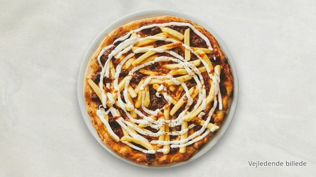 Tomatsauce, ost, pepperoni, pommes og dressing.