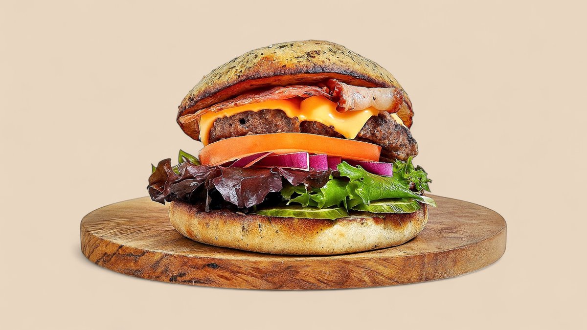 Cafebolle med bøf af 150 gram oksekød i en buffalo bolle med mayo, bacon, ost, iceberg, agurk, tomatskiver, rødløg og burgerdressing.