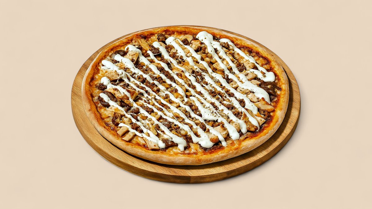 Tomatsauce, ost, kebab, kylling, oksekød, creme fraiche dressing og oregano. Serveres med en valgfri sodavand.