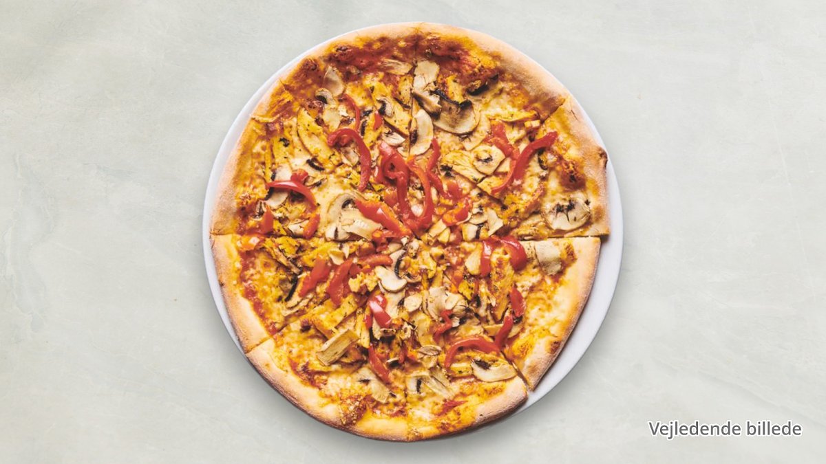 Tomatsauce, ost, jalapenos, oksekød, kylling, tomatskiver, BBQ sauce og oregano.