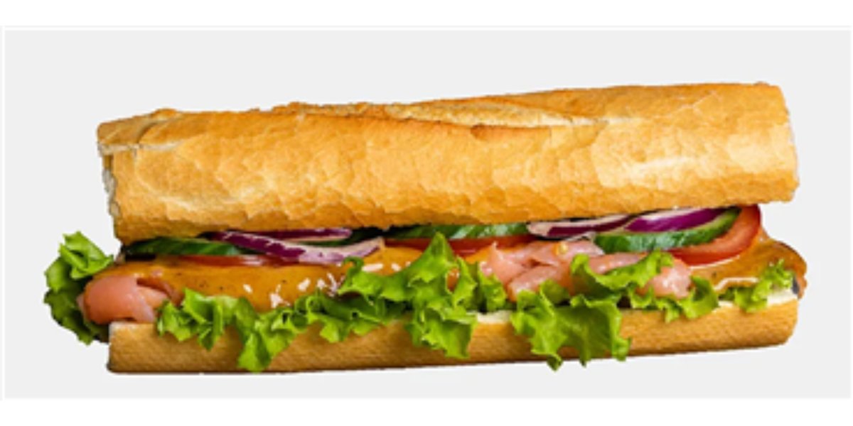 Sandwich med valgfrit brød, laks, frisk icebergsalat, tomat, agurk. rødløg og krydderiblanding, samt valgfri dressing.