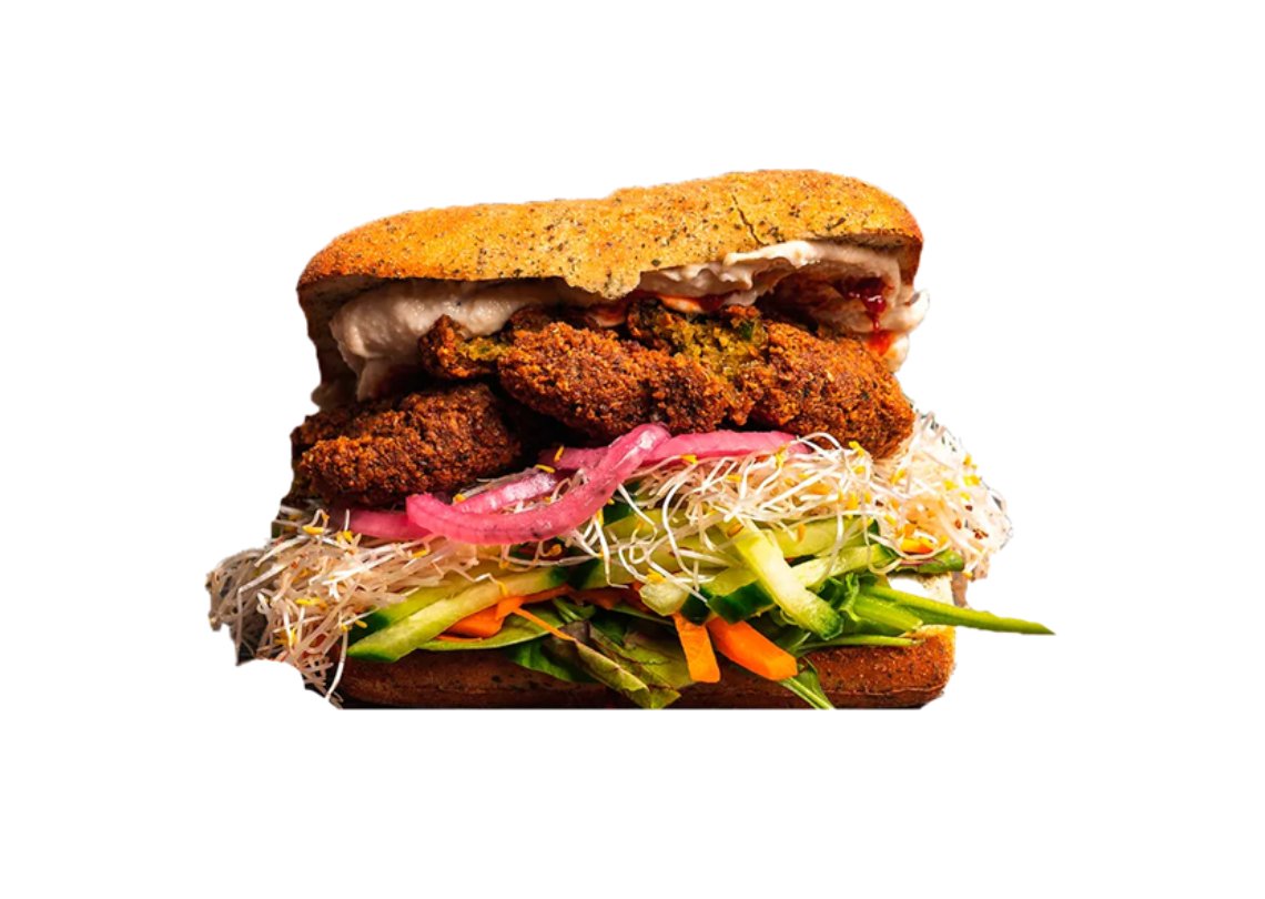 Sandwich med valgfrit brød, falafel, hjemmelavet chili, hjemmelavet hvidløg, hummus, icebergsalat, årstidens salat, revet gulerod, lucernespirer, hjemmesyltede rødløg, agurk og valgfri dressing.