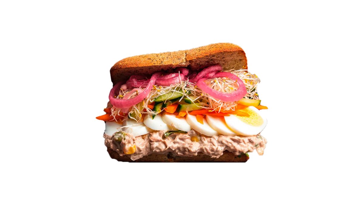 Sandwich med valgfrit brød, hjemmelavet tunsalat, kogte æg i skiver, cream cheese, icebergsalat, årstidens salat, revet gulerod, lucernespirer, hjemmesyltede rødløg, agurk og valgfri dressing.