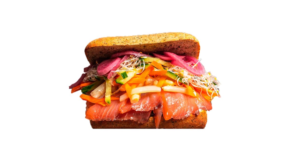 Sandwich med valgfrit brød, røget laks i skiver, asparges, cream cheese, icebergsalat, årstidens salat, revet gulerod, lucernespirer, hjemmesyltede rødløg, agurk og valgfri dressing.