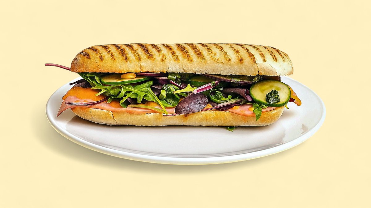 Sandwich med valgfrit brød, skinke, ost, frisk icebergsalat, tomat, agurk. rødløg og krydderiblanding, samt valgfri dressing.