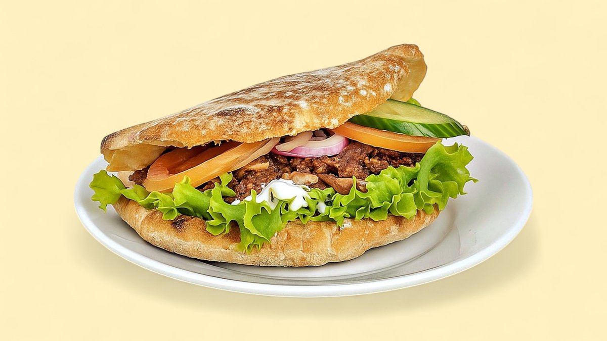 Valgfri pitabrød. Serveres med pommes frites og valgfri sodavand.