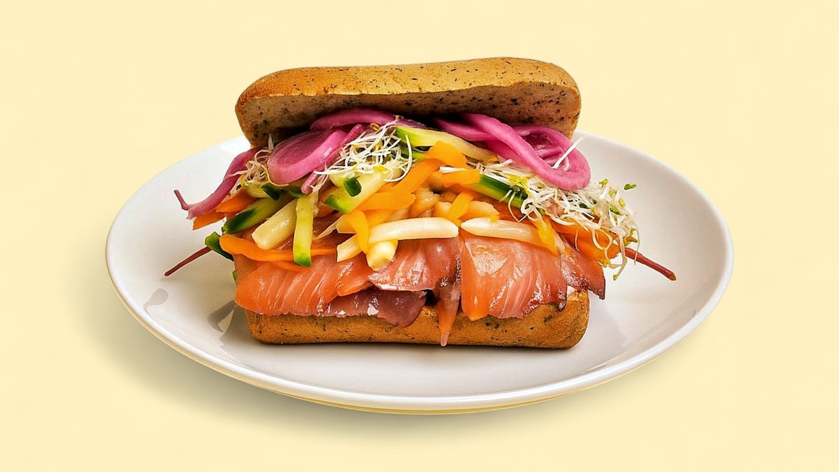 Sandwich med valgfrit brød, røget laks i skiver, asparges, cream cheese, icebergsalat, årstidens salat, revet gulerod, lucernespirer, hjemmesyltede rødløg, agurk og valgfri dressing.