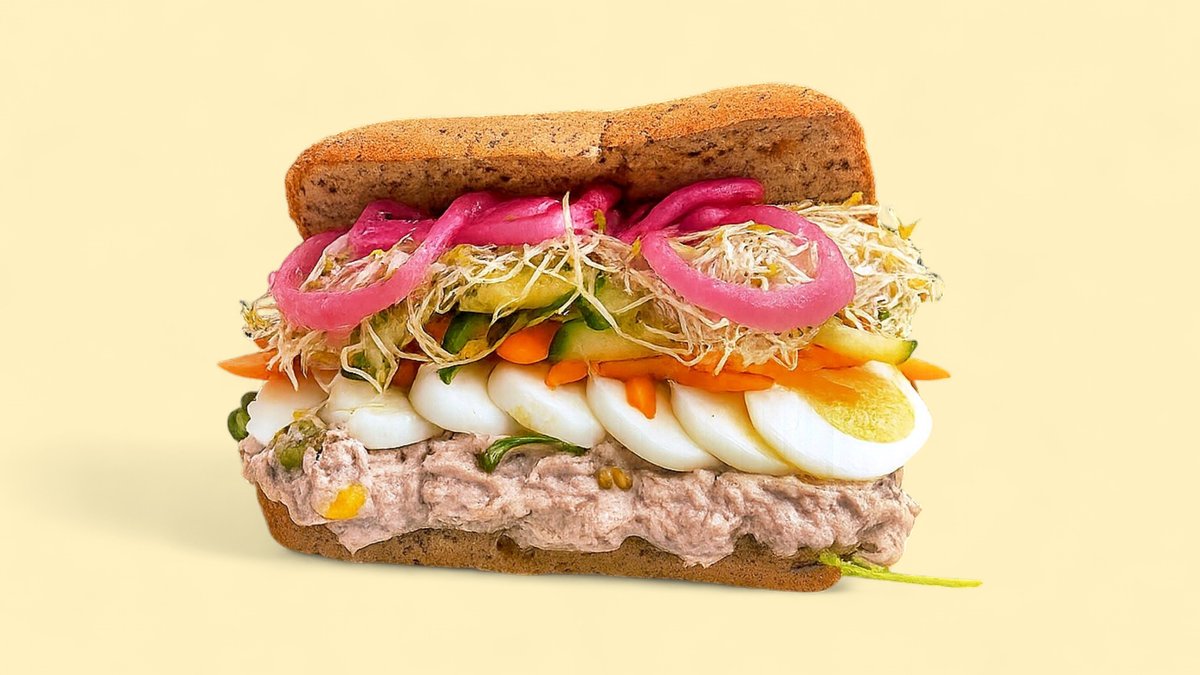 Sandwich med valgfrit brød, hjemmelavet tunsalat, kogte æg i skiver, cream cheese, icebergsalat, årstidens salat, revet gulerod, lucernespirer, hjemmesyltede rødløg, agurk og valgfri dressing.