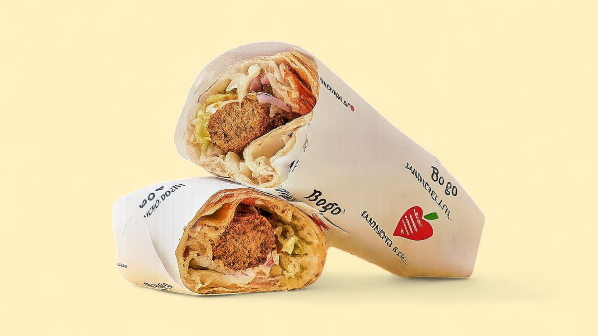 Sandwich med valgfrit brød, falafel, frisk icebergsalat, tomat, agurk. rødløg og krydderiblanding, samt creme fraiche.