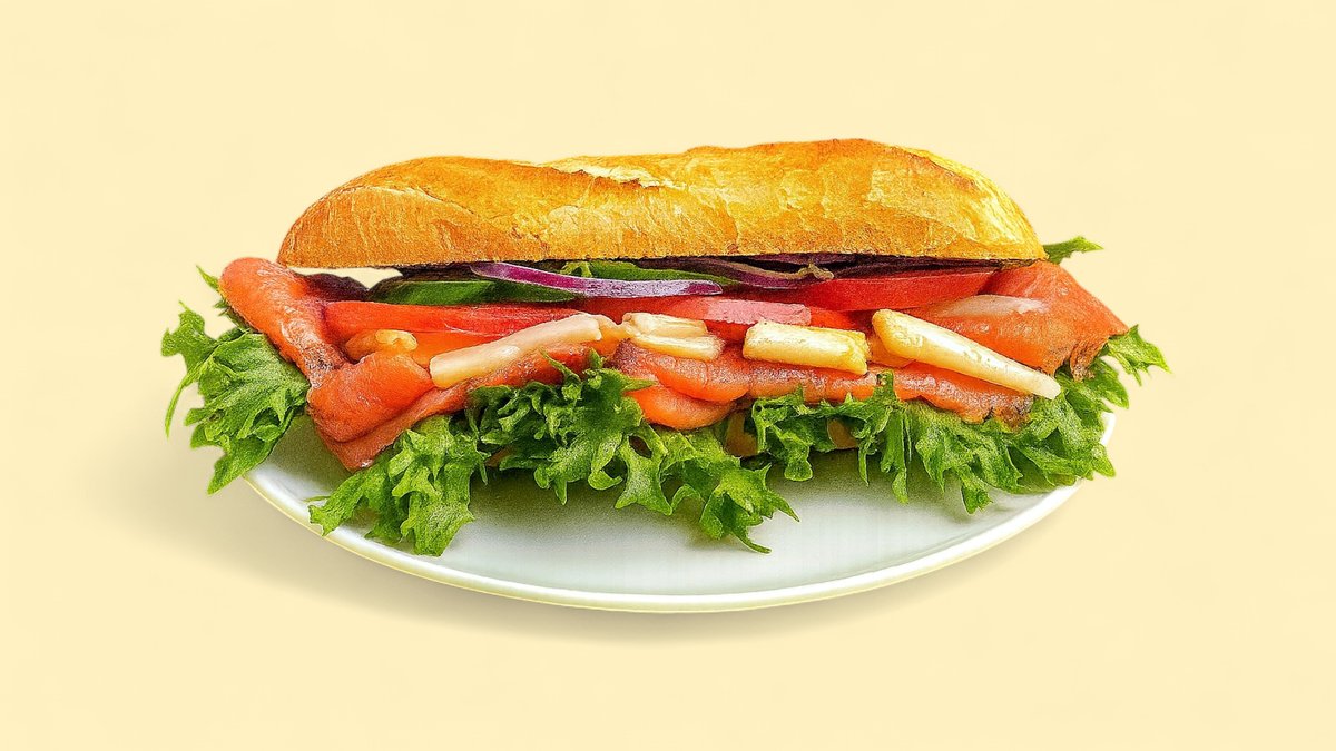 Sandwich med valgfrit brød, røget laks, bacon, frisk icebergsalat, tomat, agurk. rødløg, krydderiblanding og dilddressing, samt valgfri dressing.