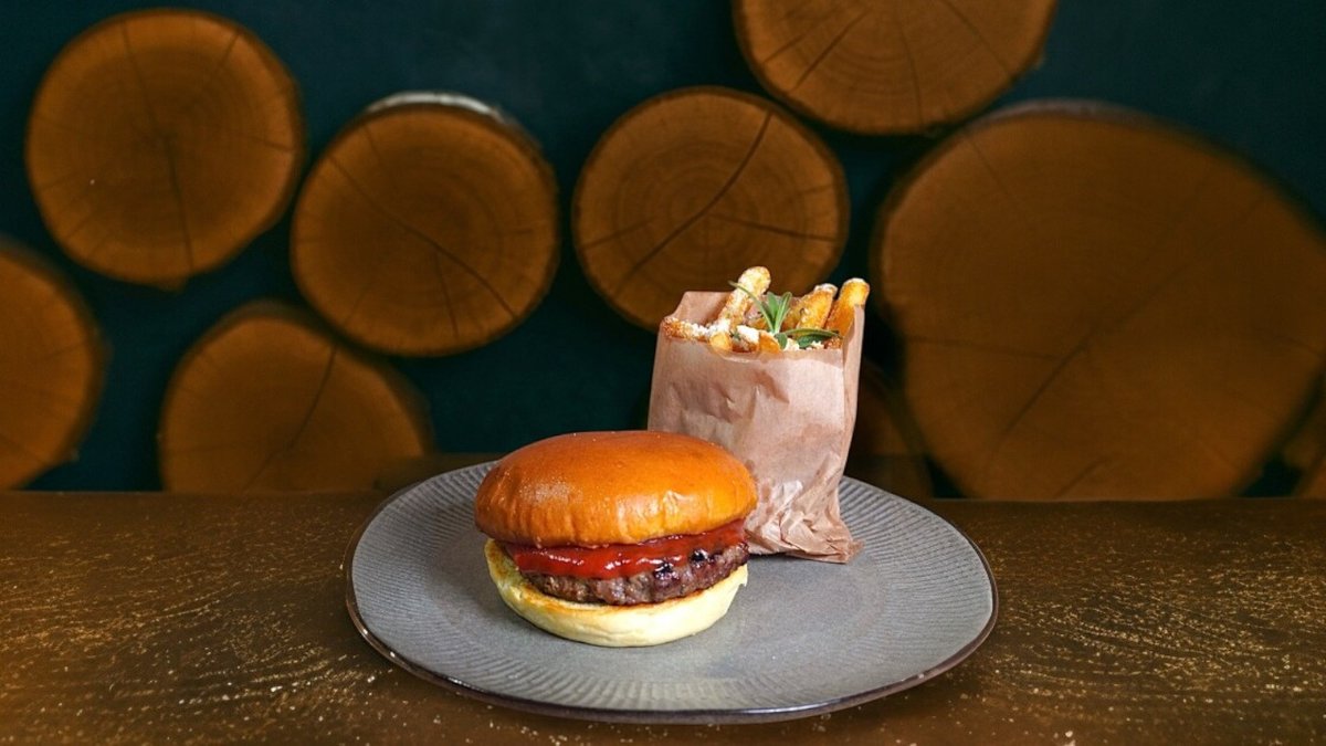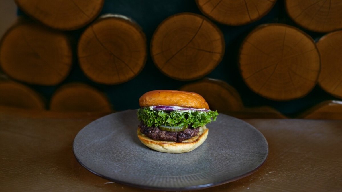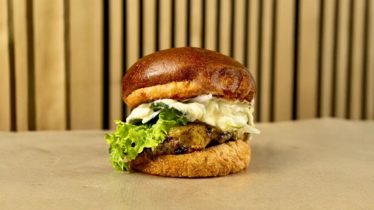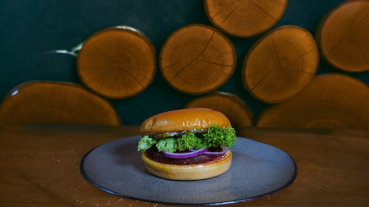 Burger med friturestegt vegansk bøf, syltede agurker, løg, salat, ketchup og vegansk mayo i briochebolle.