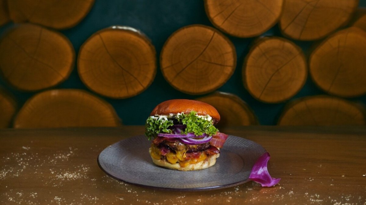 2 x flammegrillet oksekød fra Himmerland, cheddar, bacon, syltede agurker, løg, salat og husets dressing i briochebolle.