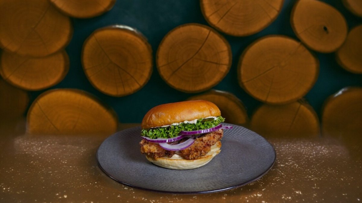 Paneret kyllinge inderfilet med syltede agurker, løg, salat og husets dressing i brioche burgerbolle.