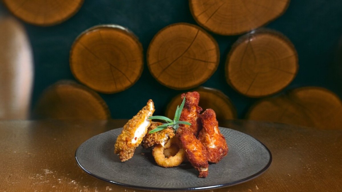 4 x løgringe, 3 x hotwings og 2 x crispy chicken.