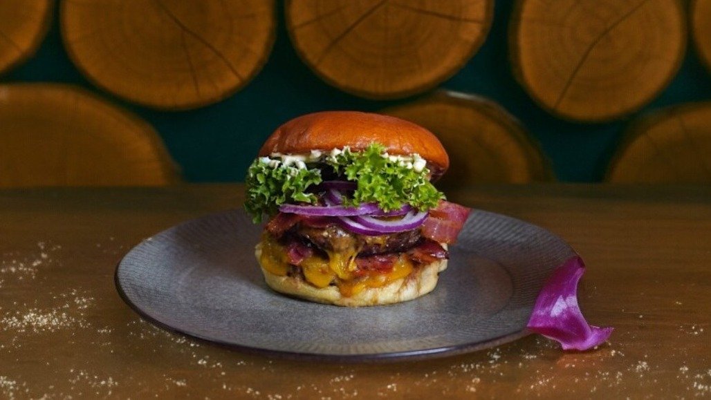 Flamme grillet dansk bøf fra Himmerland, cheddarost, bacon, syltede agurker, løg, salat og husets dressing i Brioche burgerbolle