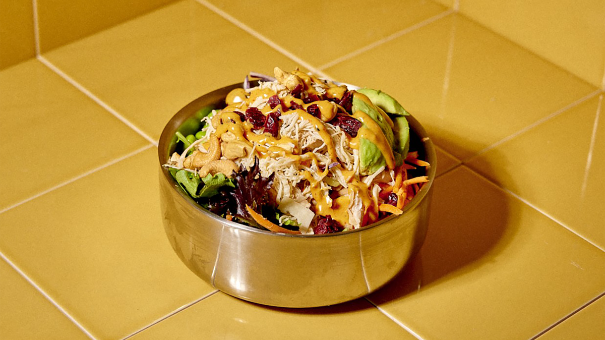 Kylling, sukkerærter, tørrede tranebær & cashewnødder. Alle salater er med salat, frisk gulerod, rødkål, avokado & valgfri dressing. Hertil valgfri drikkevare.