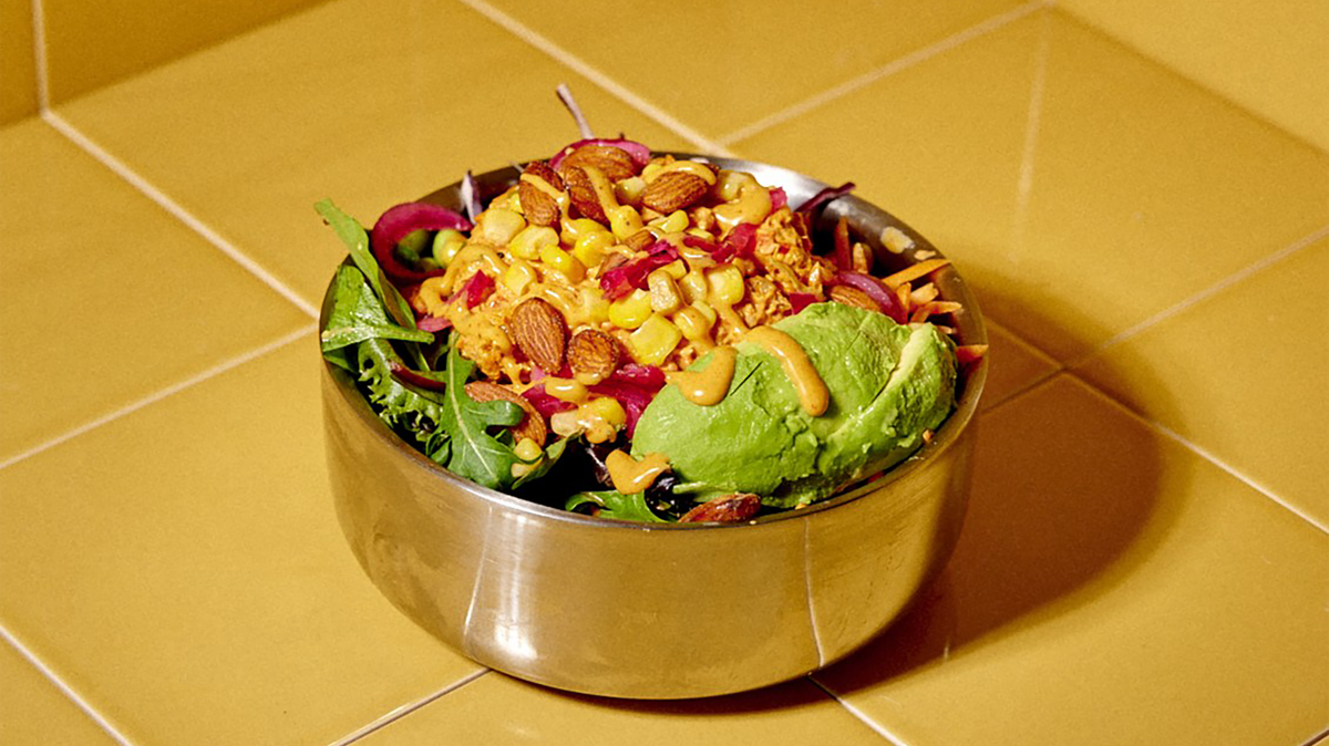 Tofu eller falafel og hummus, tomat, edamamebønner, syltet rødløg, agurk, mandler & tørrede tranebær. Alle salater er med salat, frisk gulerod, rødkål, avokado & valgfri dressing. Hertil valgfri drikkevare.