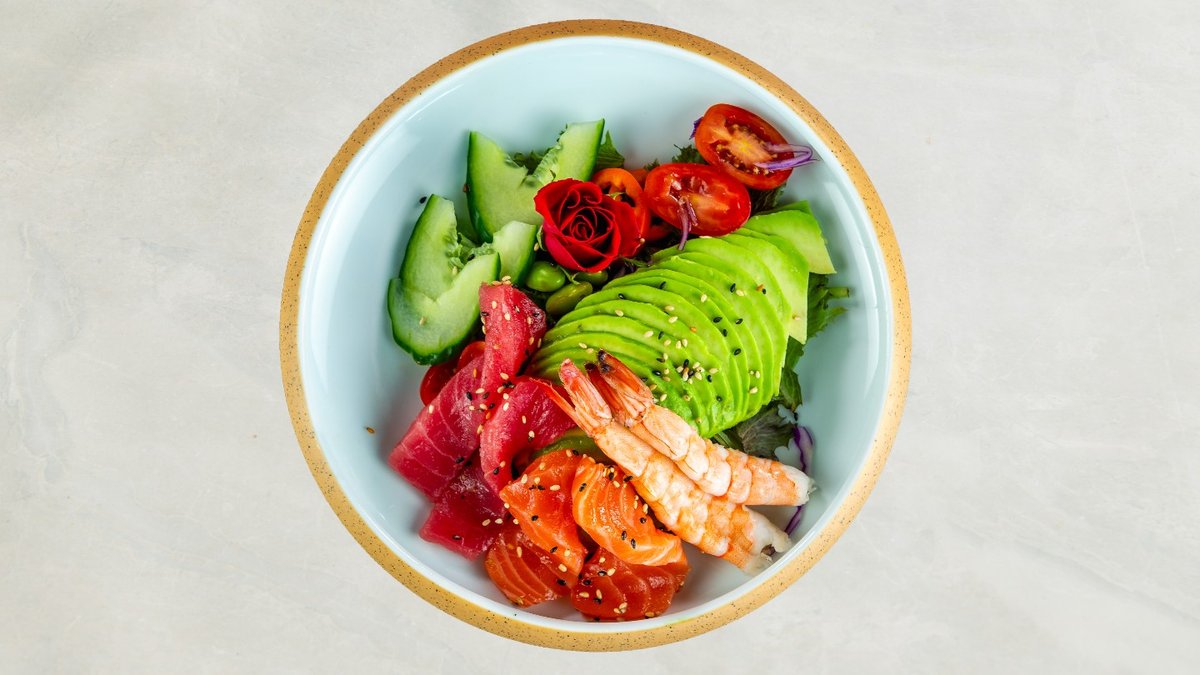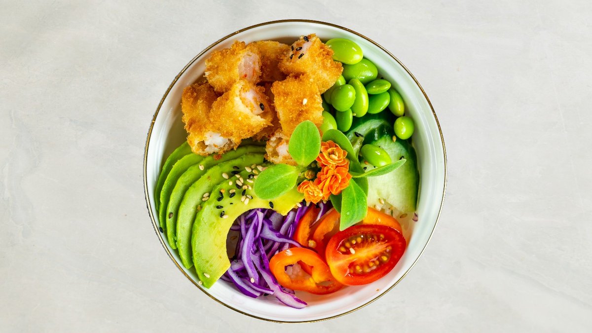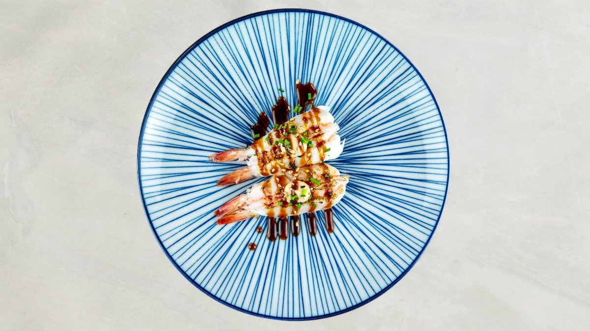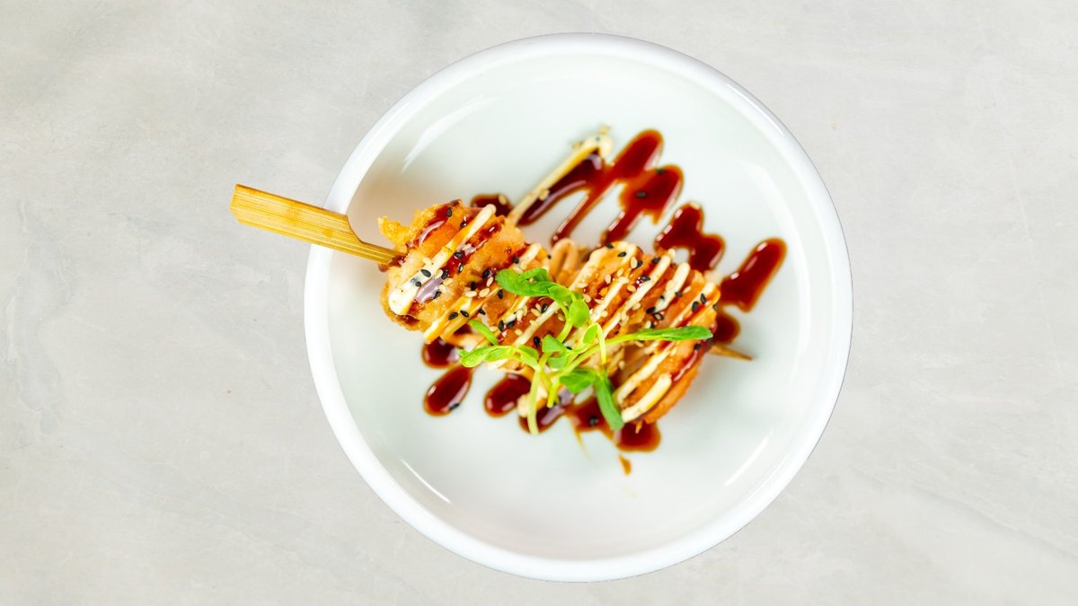 Tempura rejer, avocado, chili mayo, toppet med sesam og teriyaki.